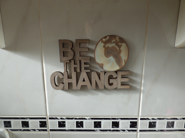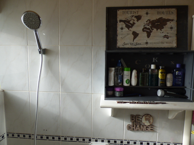 Y como estantito una de las maderas que llevaba la caja...no hace falta más para dejar sus botes de cosas de aseo...