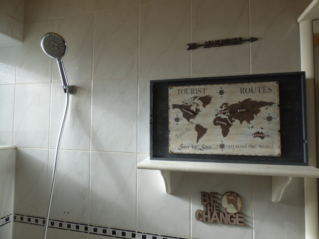 El almohadón de tela mapa mundi no puede irle mejor. Parece rosa, pero es beige.....como quiero comprar una banqueta para este mismo baño, igual le pongo el almohadón encima....y todo conjuntado.