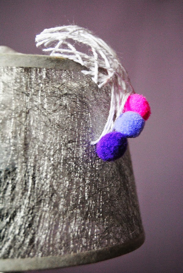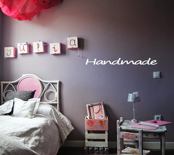 Sobre el cabecero, su nombre. Cajas de cartón recicladas con una manita de pintura y botones de colores. Para rematar una guirnalda de pompones.