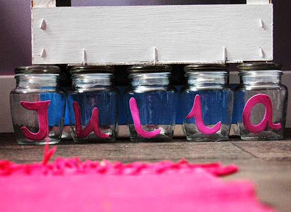 La mesilla son tres cajas: dos de cerezas en blanco y una más de madera en rosa. Como me parecía que quedaba demasiado baja, unos tarros de cristal hacen de pies.