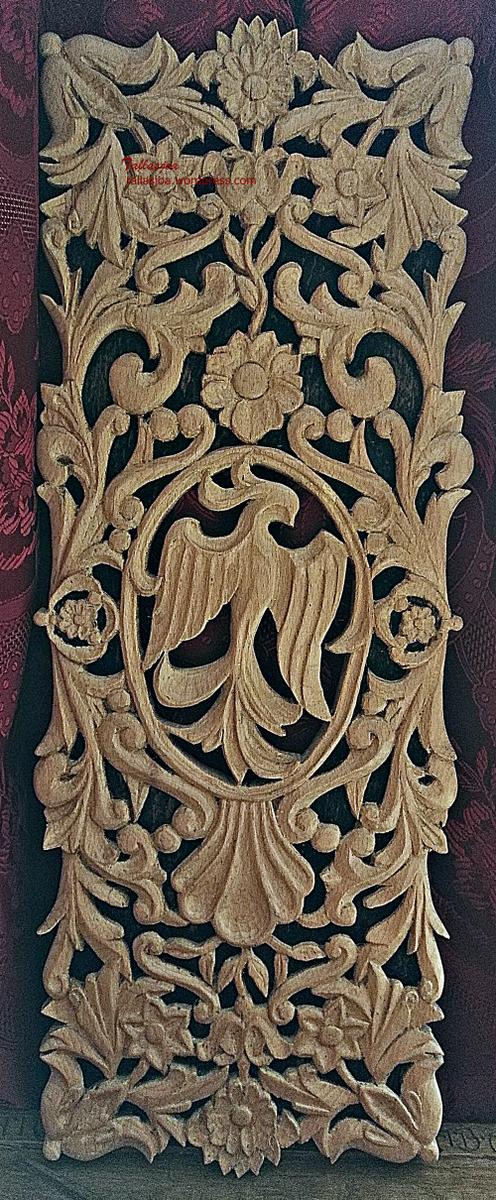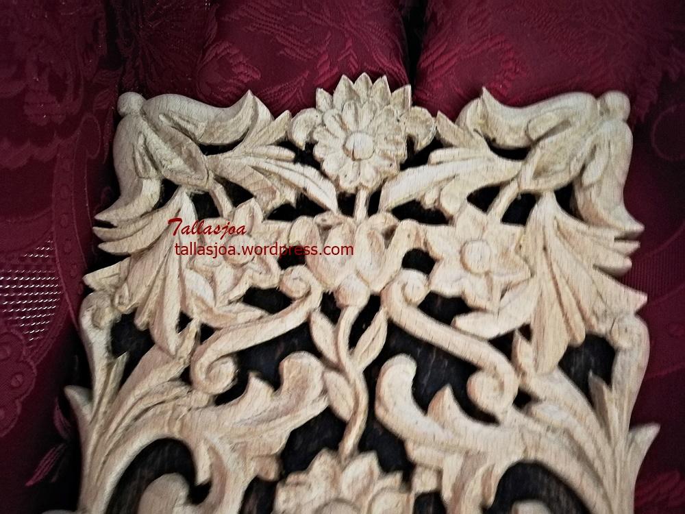 La talla representa un ave del paraiso enmarcada en motivos vegetales
