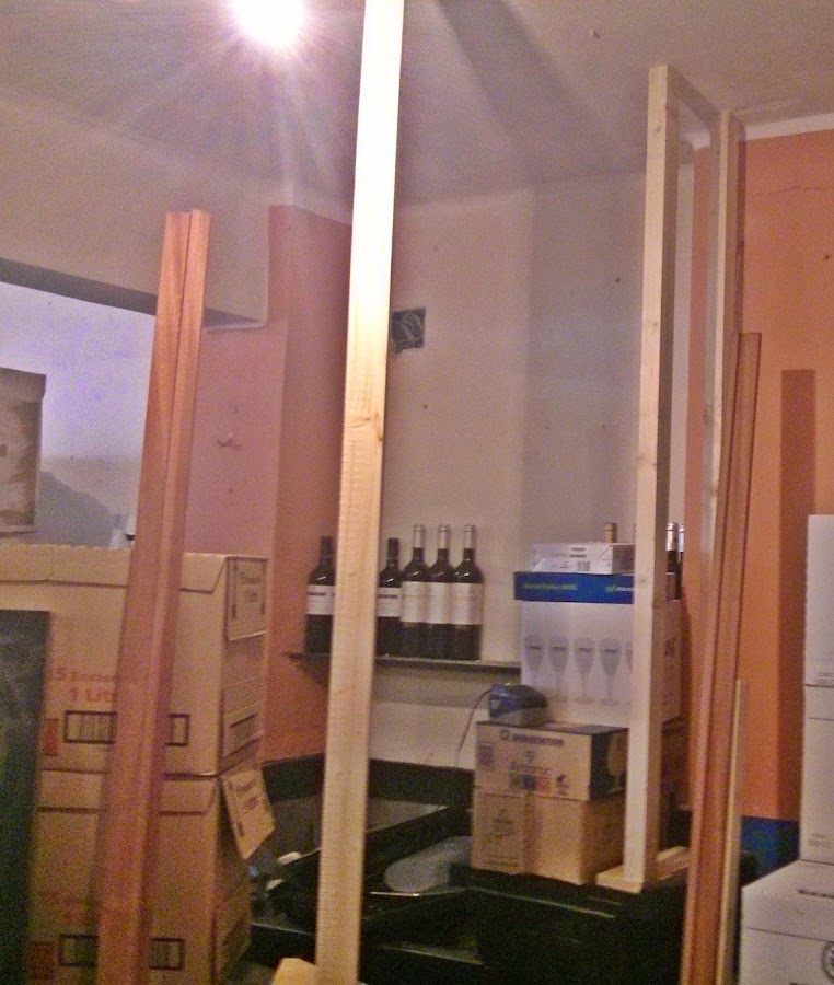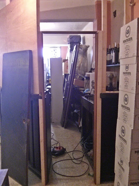 Una vez terminado casi de colocarlos, en la entrada que tenia la barra, era un espacio muy reducido unos 64 centímetros, y para mas, había que aprovechar una puerta que había sin uso y era de 60 cm. entonces improvise y coloque los listones de madera para poder poner los marcos de la puerta y así poder colocarla.