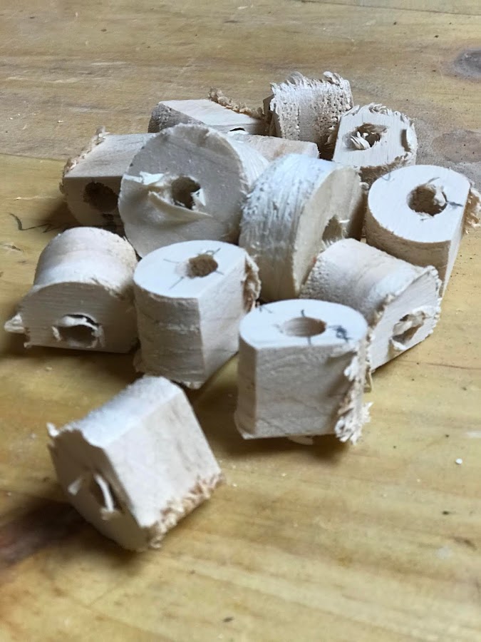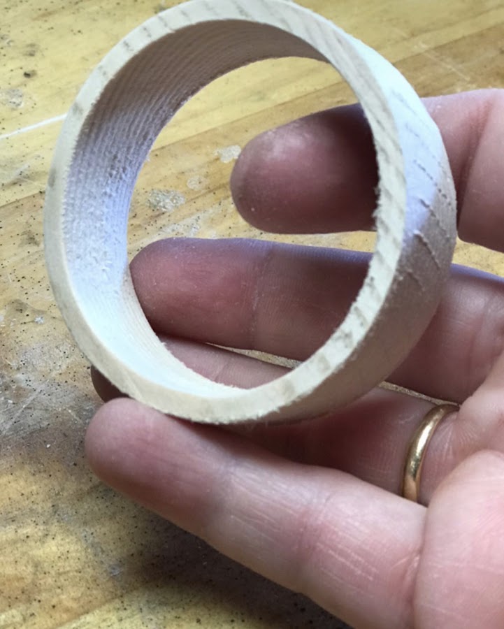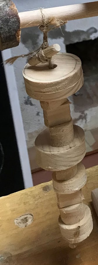 Tuve la idea en su momento de no tirar los semicirculos que saqué al hacer la imitación de las molduras del comedero. Las lije y coloqué, con un trozo de cordel kraft, una encima de otra y la colgué de una varilla tipo llavero.