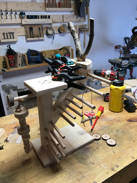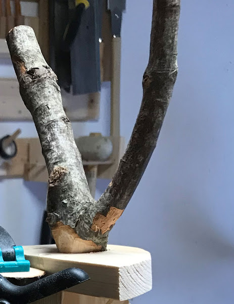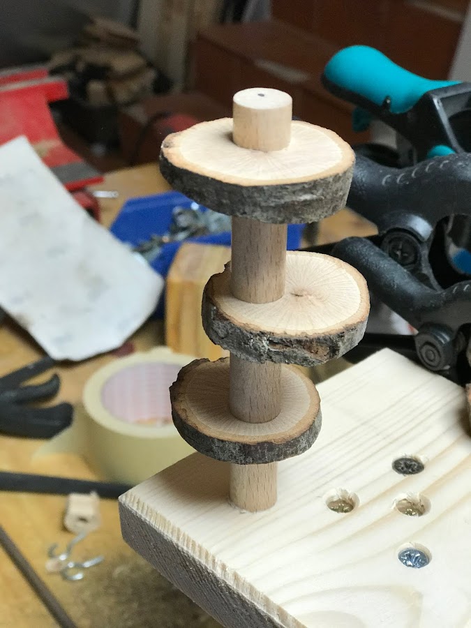 Coloqué dos bases de apoyo, una de ellas con un tronco en forma de "V" de tronco de encina, y otro con sobrantes de rodajas de encina y una varilla hice un pequeño arbolito.