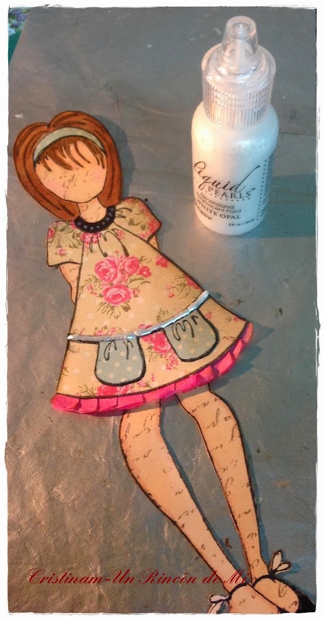 Con esto ya tengo la muñeca casi terminada... me gusta sombrear todos los bordes con tinta vintage photo... y añado unos detalles al cuello y bolsillos ... perlitas líquidas con el producto liquid pearls que se ve en esta foto.