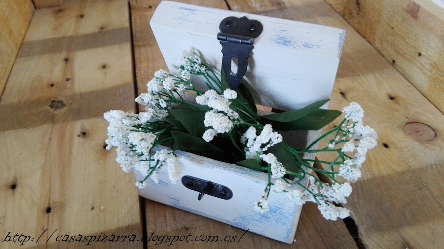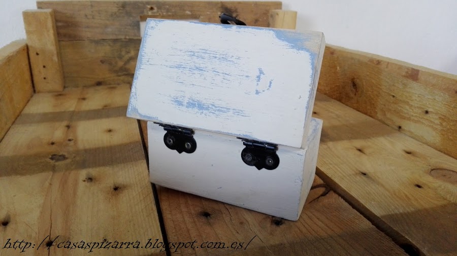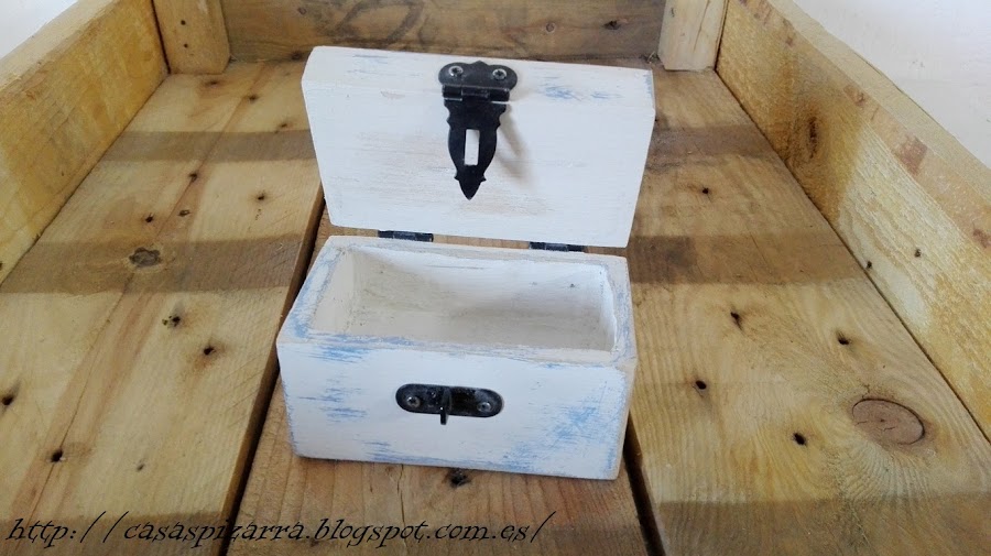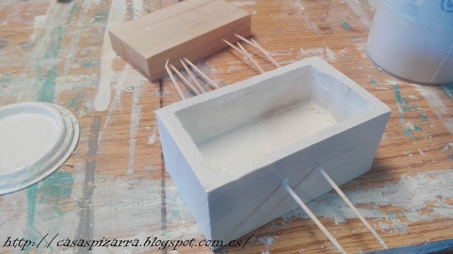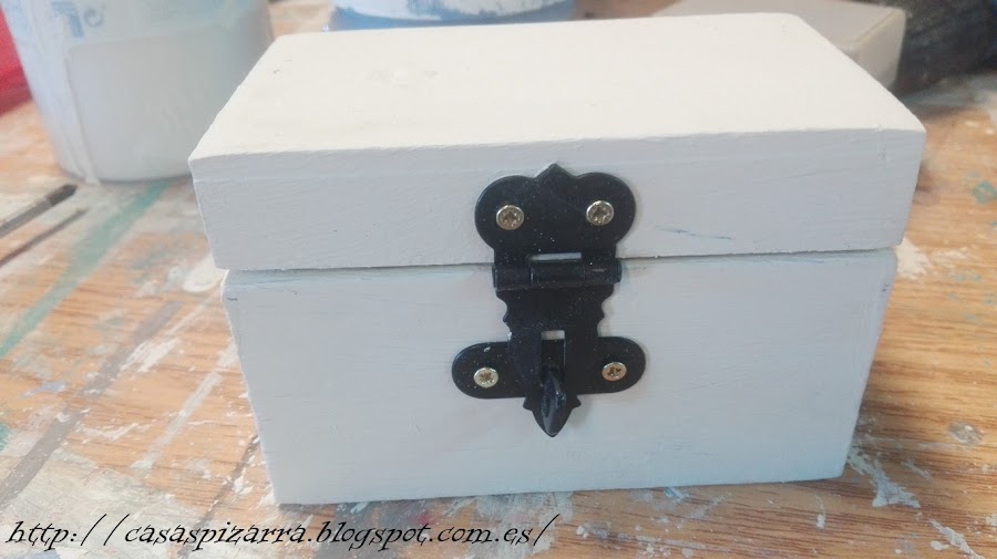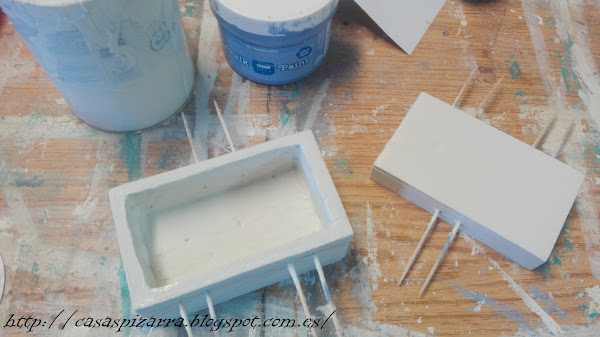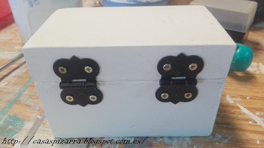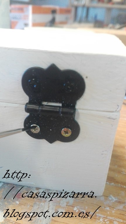 En las fotos podéis ver unos palillos clavados en la madera, los puse así mientras pintaba para no perder de vista los agujeros que antes le hice para colocar las bisagras y el cierre