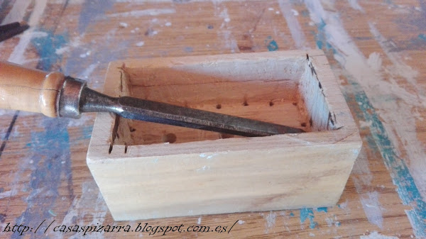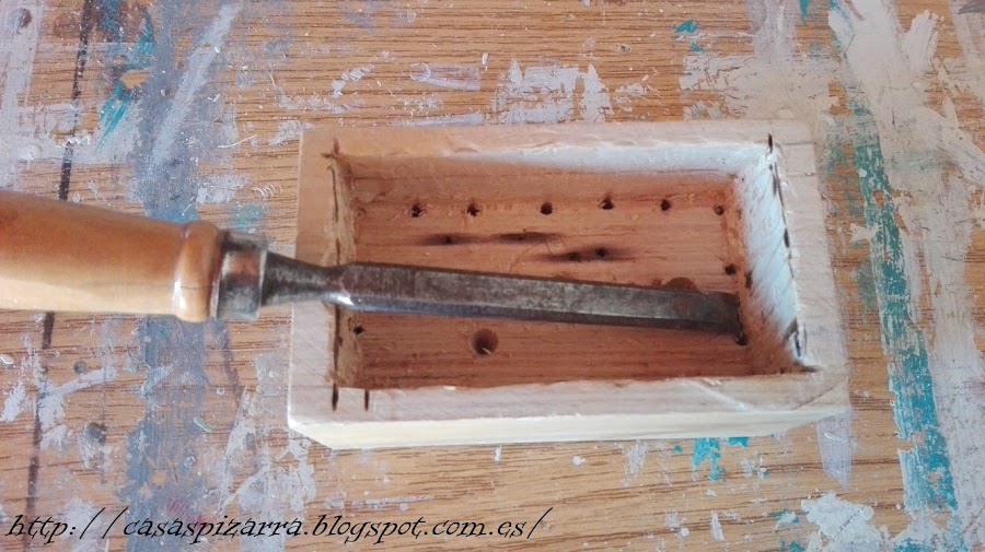 A la parte mas gruesa le hice una serie de taladros, con cuidado de no traspasarlo, para facilitar el vaciado, luego utilicé formones de distinto tamaño.