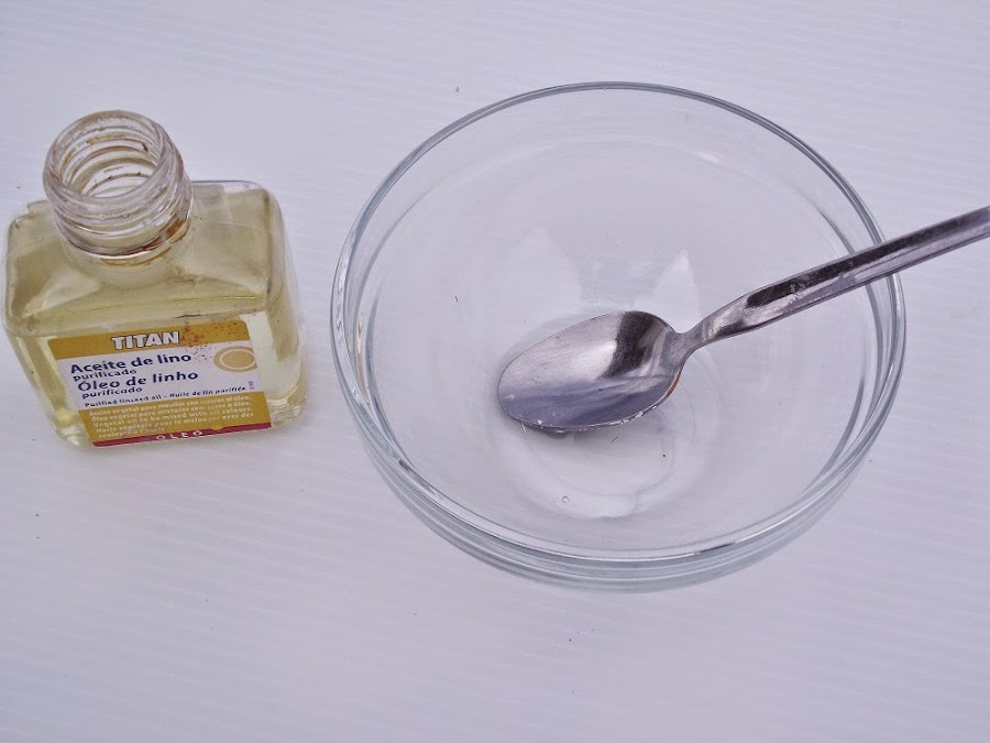 Ponemos una cucharadita de aceite de linaza y tres de aguarrás puro (esencia de trementina).