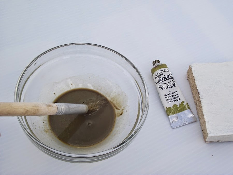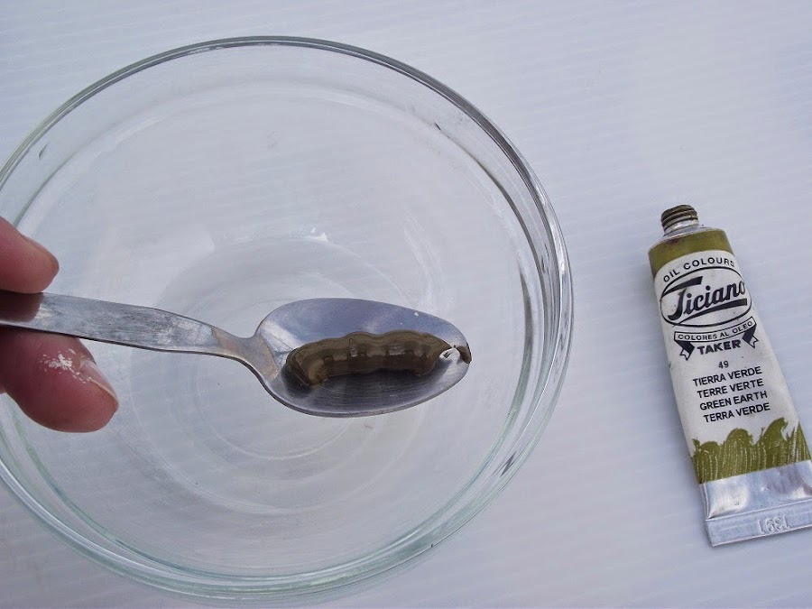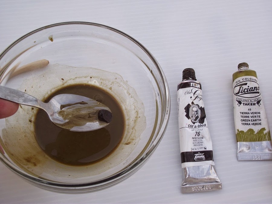 El procedimiento es el mismo, ponemos en el bol el aceite de linaza y la esencia de trementina. Después una cantidad pequeña de óleo tierra verde y una pizca de color pardo.