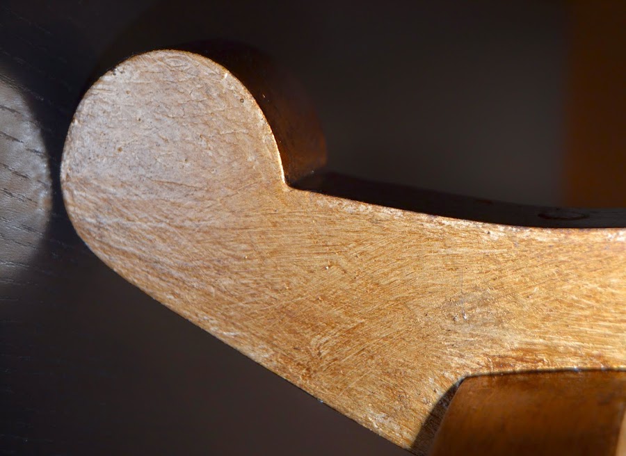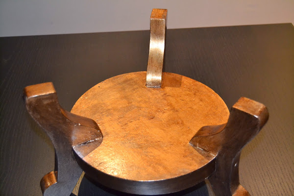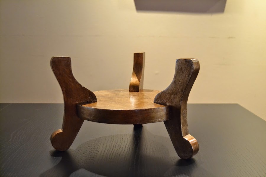 Primero le dimos una capa de gomalaca. A continuación una de rojo inglés y después dos capas de dorado (lijando entre ellas). Una vez secas, una capa de gomalaca y lo envejecimos con betún de judea. Una vez seco del todo, la terminamos con otra capa de gomalaca.