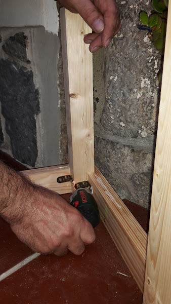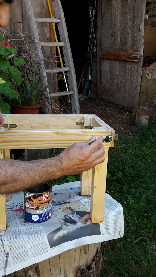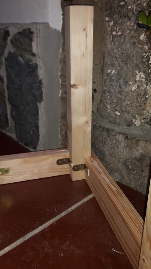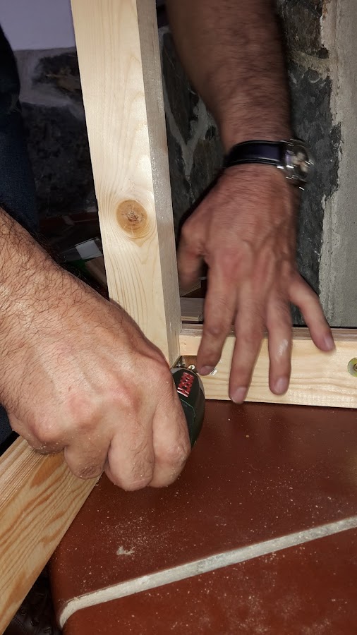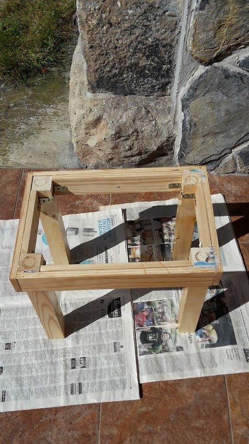 Una vez pegadas es cuando ponemos unas escuadras atornilladas a las patas y a la madera de los lados.