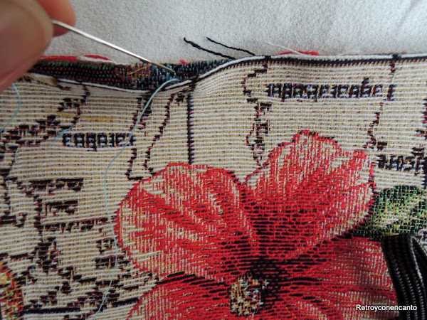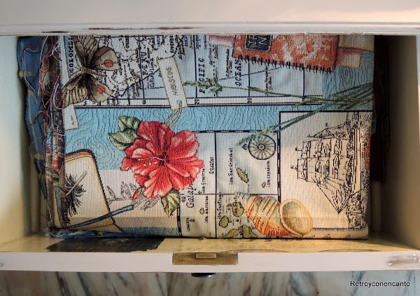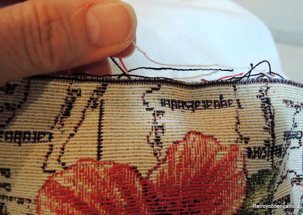 Desde el primer momento tuvimos en mente hacerle algún adorno a cada cabecero. Pensamos en varias posibilidades, hasta que una cobró más fuerza. Guardábamos un pequeño retal de la tela que empleamos en arreglar este costurero puf. Se trata de un tejido bastante grueso con motivos de gran tamaño.