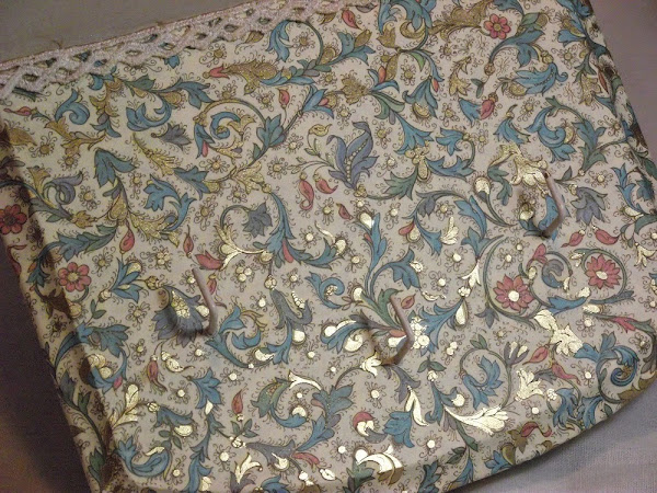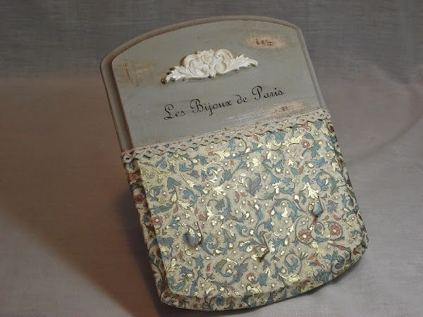 Pinté la parte superior con pintura acrílica gris a la que di una pátina muy ligera de color sombra y en la parte inferior pegué un papel a tono con la pintura, con unos toques dorados que le dan un aspecto muy atractivo. En la parte superior coloqué una moldurita de escayola de Lucía Sapena, que pinté en color beige claro y patiné con la misma pátina que apliqué a la pintura. Para separar la parte pintada de la parte empapelada puse una puntilla pequeñita de algodón, que previamente envejecí con agua y café.