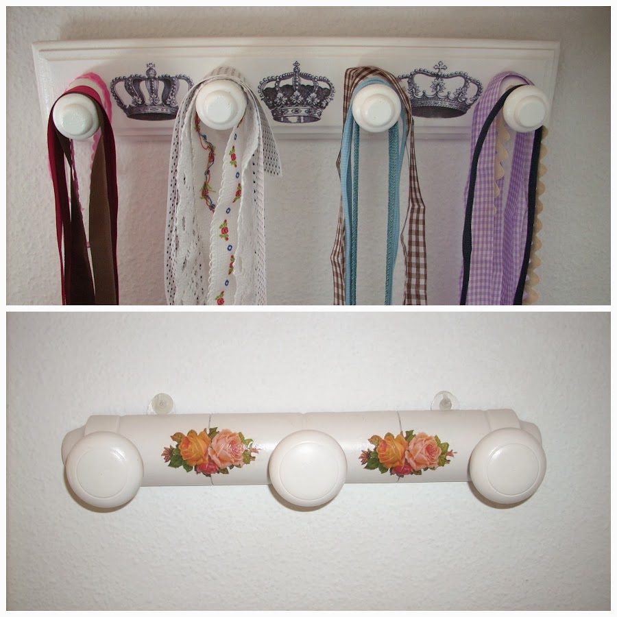 También os muestro otros percheros sencillos pero muy resultones. El primero lleva las coronas en transfer y el segundo las flores son decoupage.