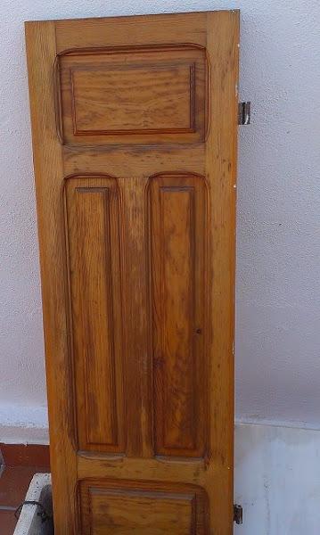Este que os muestro era de una puerta de hierro que había en el patio de mi casa y que en la parte superior tenía cristales y cuarterones de madera. Está muy estropeado por el sol, que le daba directamente, y por los años que ha pasado en el doblao, sin limpiar y sin renovar el barniz. Pero al ser una madera de pino sólida y sin carcoma pensé que respondería bien a cualquier tratamiento.