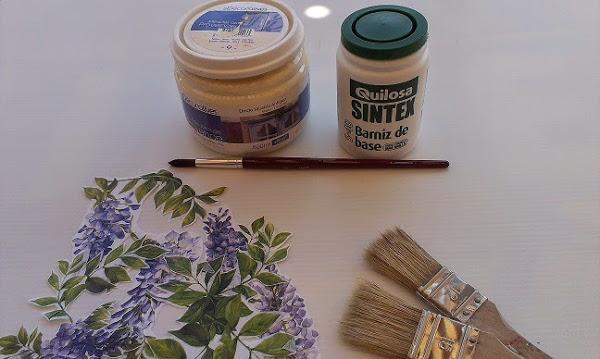 El cuarterón, pintura acrílica, motivos florales de una hoja de papel de arroz, pátina marrón clarito y barniz al agua para proteger. Además, claro, decapante para eliminar todos los restos de barniz, papel de lija de distintos grosores y trapos de algodón para retirar la pátina.