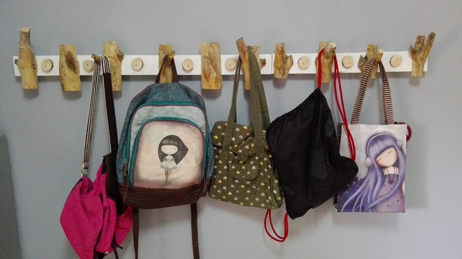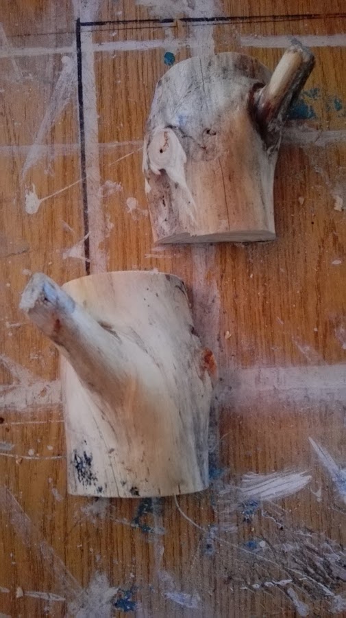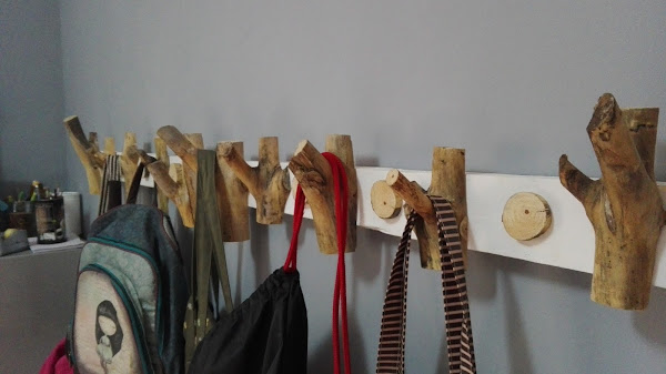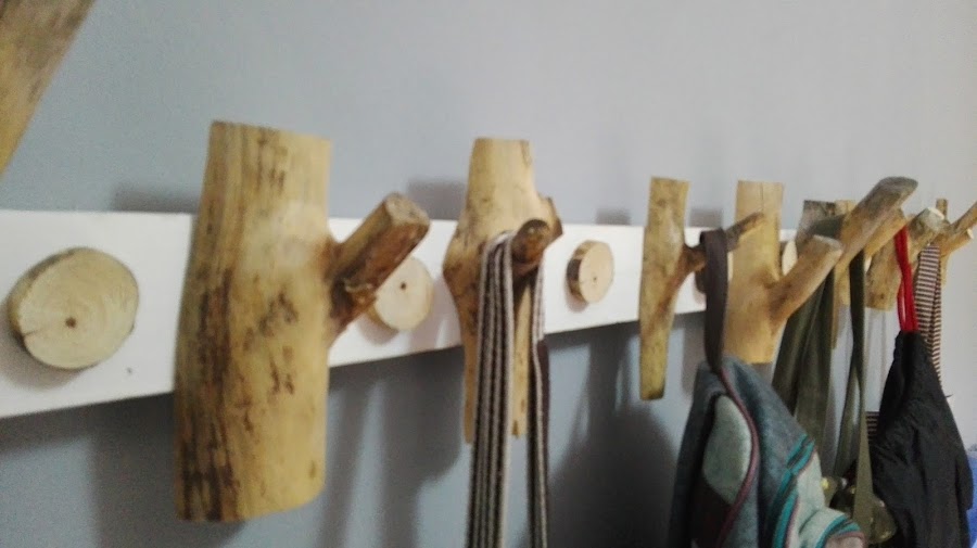 Así recurrí al montón de madera de la poda de los pinos, allí estaba la solución, sencilla y barata, únicamente debía cortar las ramas para sacar los trozos donde debían colgarse los abrigos y mochilas.