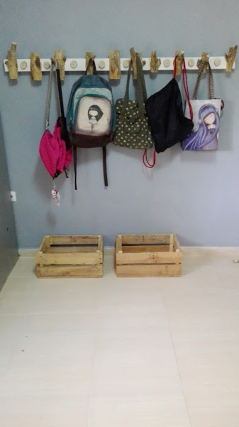 Las cajas, también hechas de madera de palés sirven para colocar las mochilas de los libros que son más pesadas.