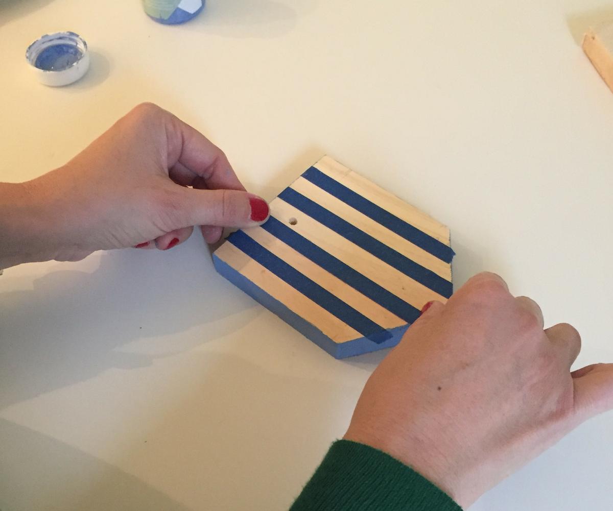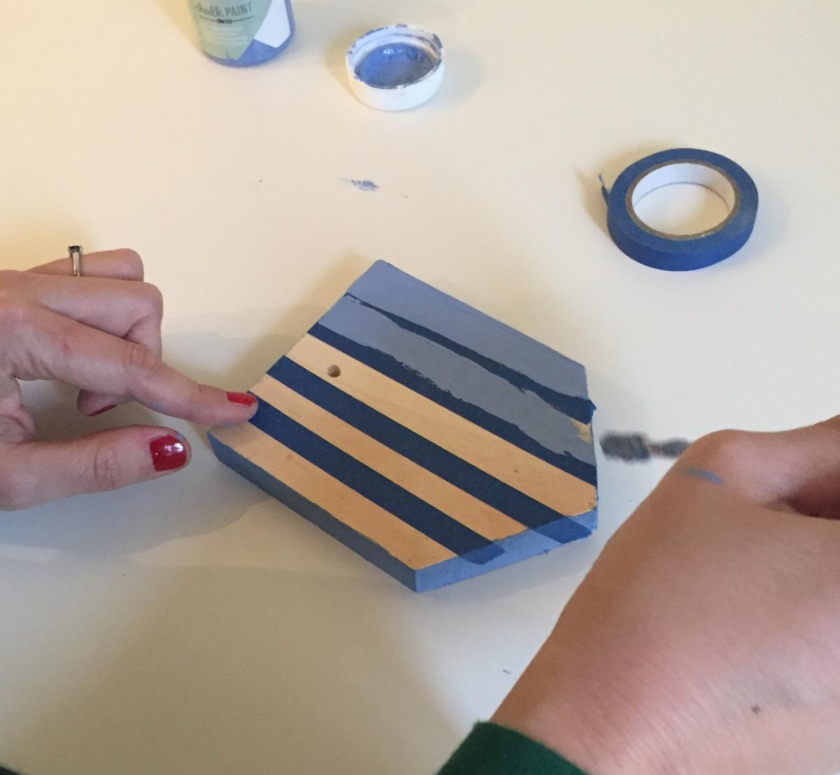 Paso 3: ahora toca pintar 1) pintamos los bordes con la pintura de tiza azul 2) para conseguir las rayas colocamos tiras de washitape dejando un hueco entre ellas 3) pintamos con la pintura chalkpaint toda la superficie 4) cuando esté seco retiramos el washitape con cuidado.