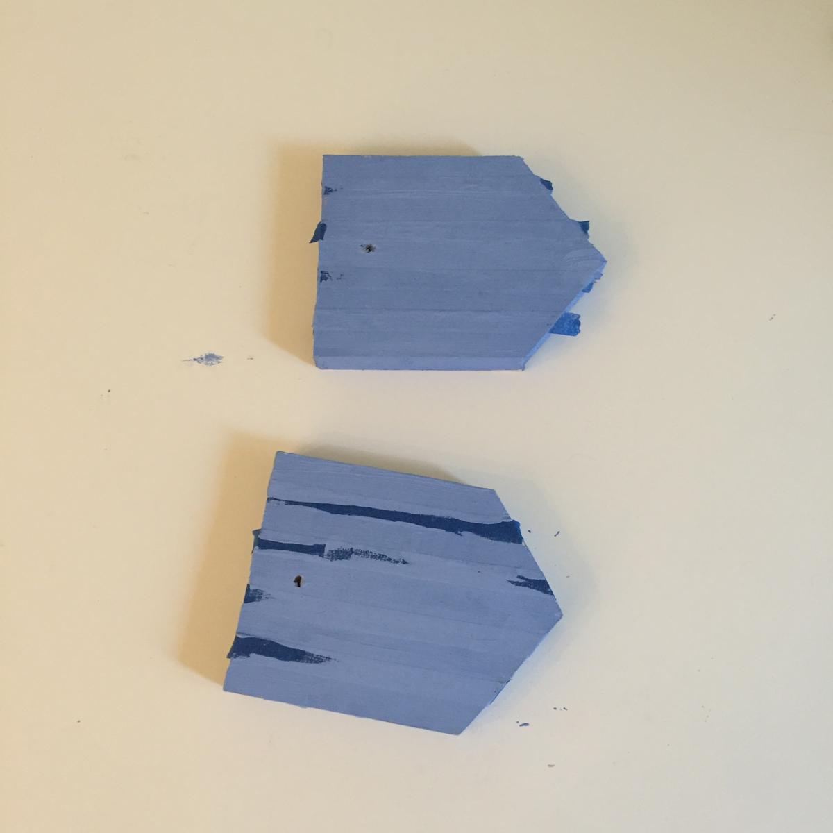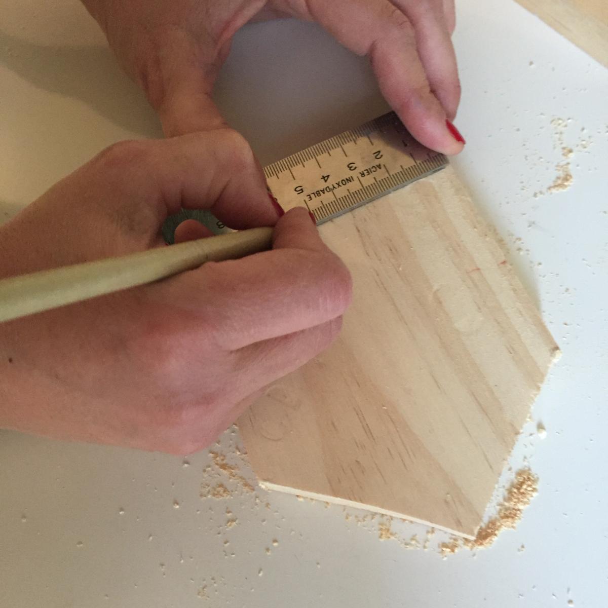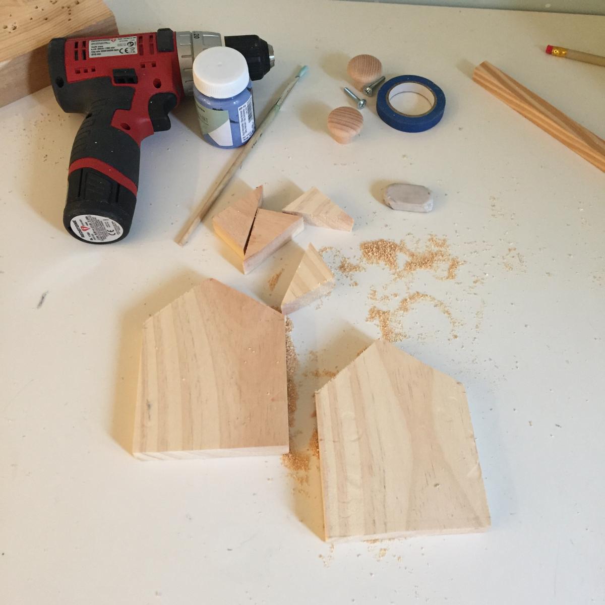 Paso 1: lo primero es dar la forma de casita a la tabla de madera, para ello, primero hemos cortado la tabla para conseguir dos trozos de 10×13 cm, y luego hemos marcado y cortado el tejado.