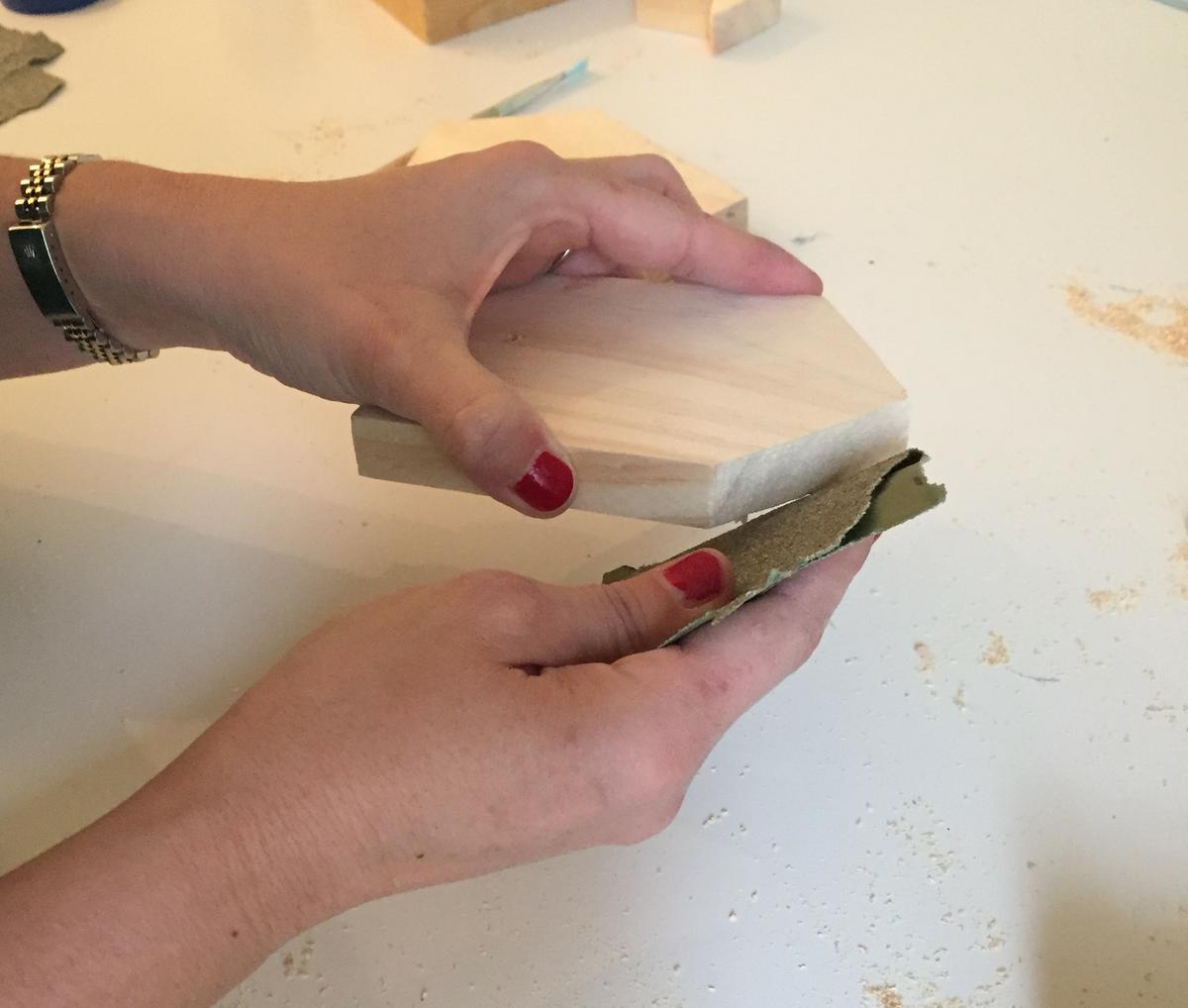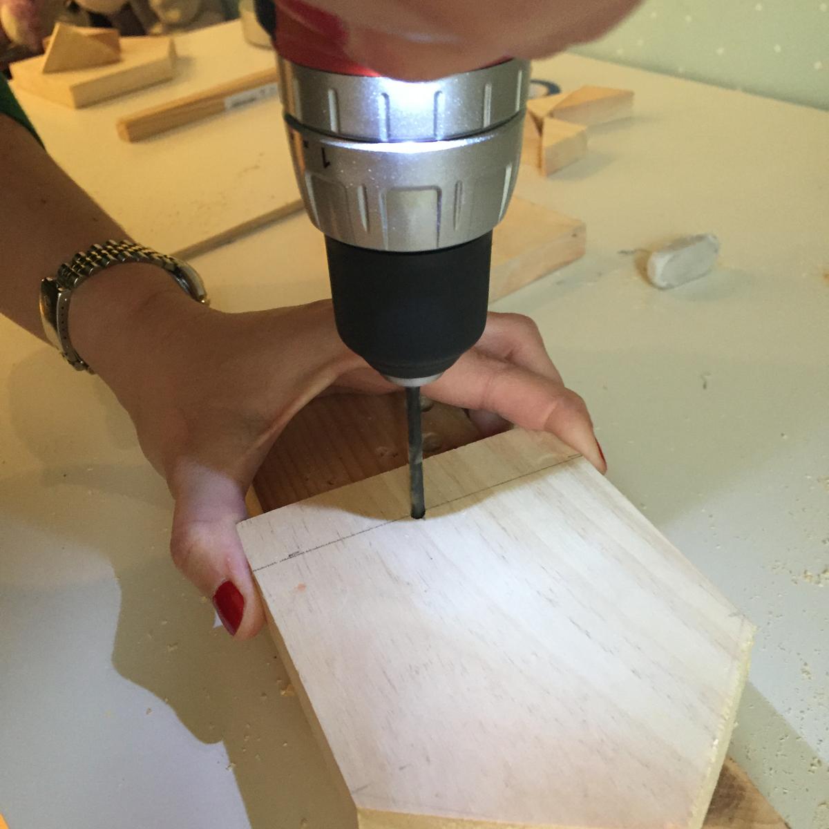 Paso 2: marcamos el centro del ancho de la tabla y a 2 cm de la base hacemos un agujero con el taladro, en este agujero colocaremos el pomo más adelante. Lijamos para quitar las posibles rebarbas y ya tenemos la forma de la caseta.