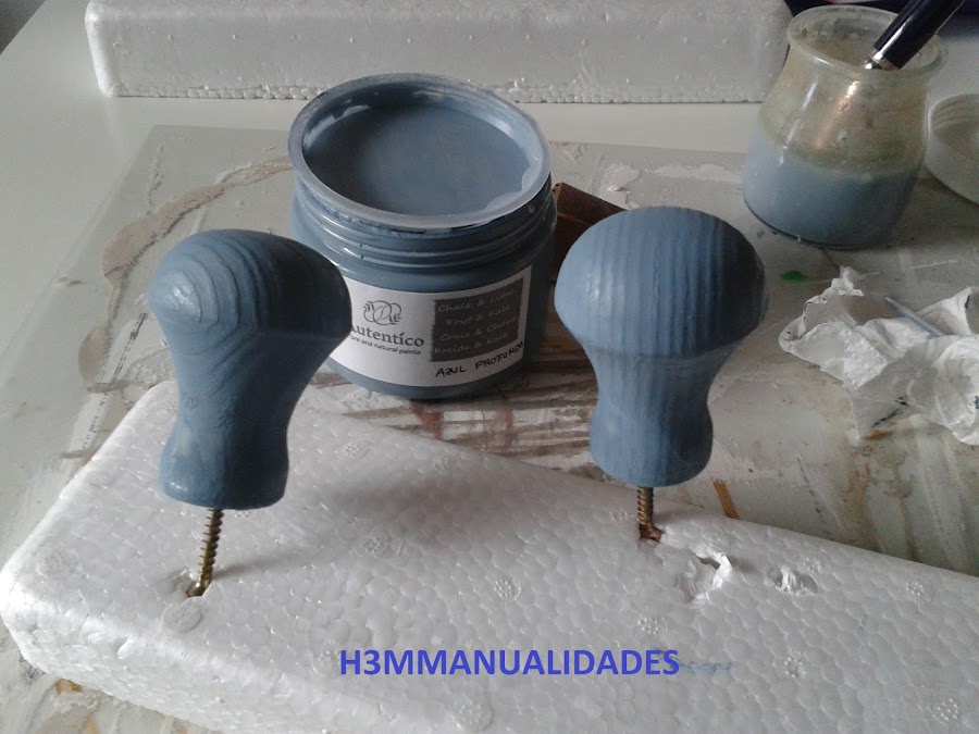 Como tiene algún mueble que tiene algunos cajones y pomos azules, buscamos uno que entonara y nos decidimos por el "azul profundo": lijar la madera y dos-tres manos de pintura.