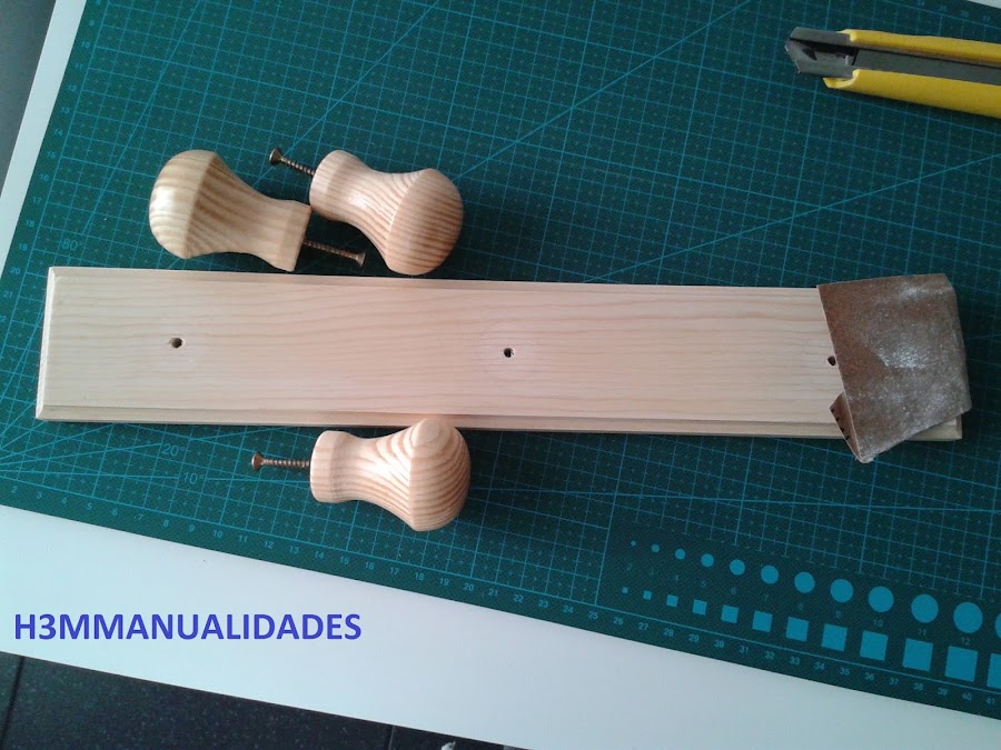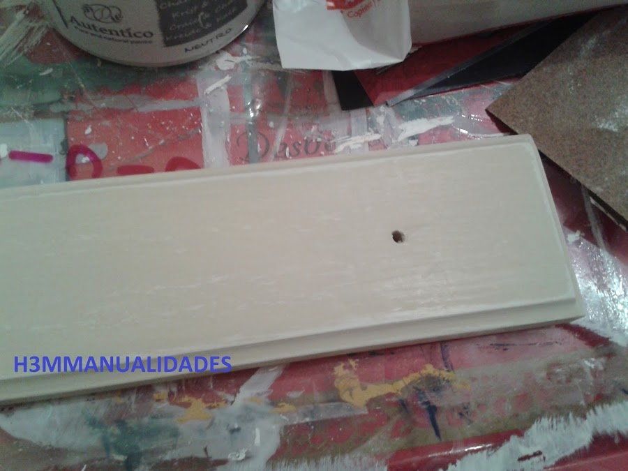Tras una buena lijada para quitar el barniz, pasé a la pintura (efecto tiza). Primero una base de color "blanco neutro", y sobre él, tras pasar la cera de una vela por algunos lugares, nueva mano con pintura color "ocre antiguo". Entre los dos elegimos estos colores porque iban muy bien con otros detalles que ya tenía en la habitación. Pasada de lija para sacar el decapado blanco de debajo y a por los colgadores.