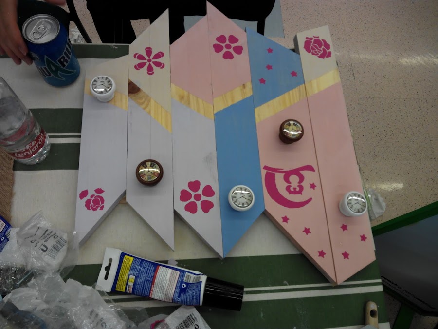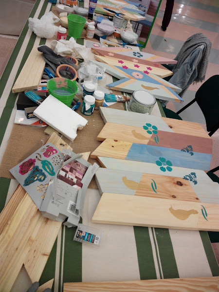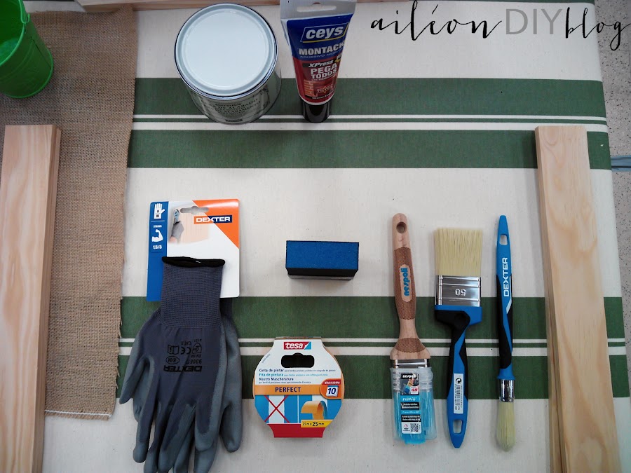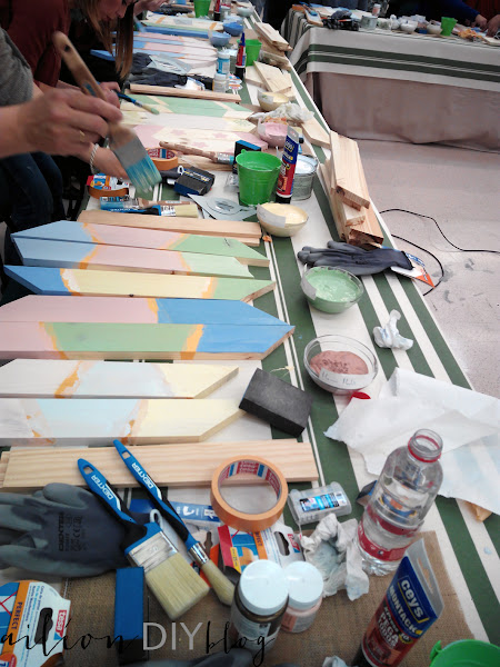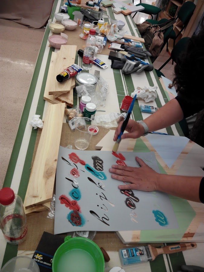La verdad que fueron un par de horas muy bien aprovechadas en las que pudimos hacer un perchero con listones de madera, pintura, plantillas y pegamento como podéis ver. Los guantes estaban ahí, sí, pero yo soy de las que "se manchan" las manos normalmente, como que controlo más todo si estoy en contacto directo con los materiales.