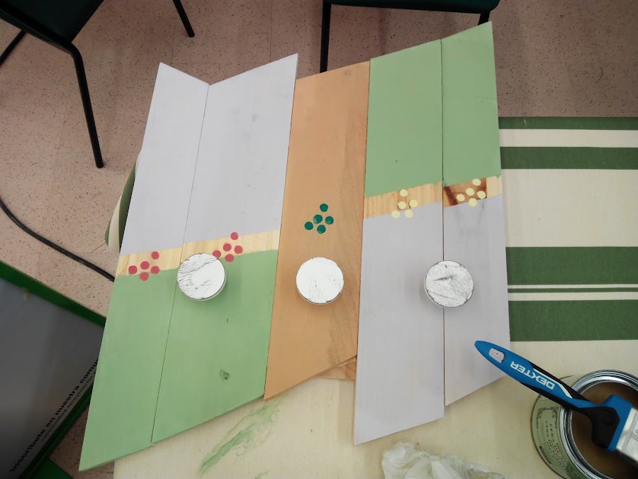 Después con cinta tipo carrocero hicimos el montaje para elegir qué pintar y qué no. Teníamos un montón de colores de milk paint para elegir, los cuales nos habían preparado previamente en el taller.