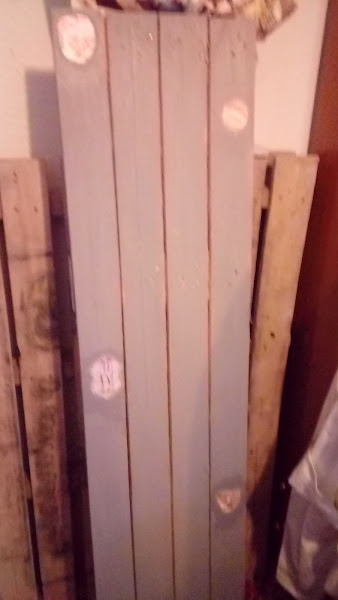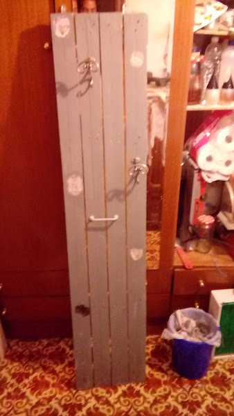 Yo parti de esta manera. Lo primero que hice fue pintar de gris con pintura a la tiza. Le puse papel de decupage, unos encanhes para la ropa, y un tirador. Ahah! Antes de ponerle los metales le puse cera, para proteger.