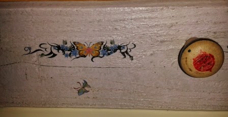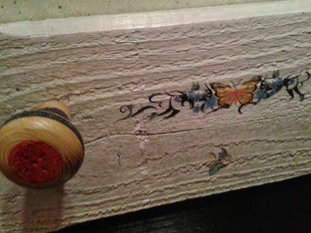 Primero le hemos dado una imprimación. A continuación, con pinceladas muy estiradas, una capa de color blanco, y por último una capa ligera en color malva. Como es para una habitación de niña, le hemos aplicado unas mariposas de colores. Para los colgadores hemos utilizado unas peonzas antiguas que teníamos guardadas. Están atornilladas por la parte trasera. Aunque las fotos no se ve todo el perchero entero, mide 1 metro y tiene cinco peonzas.