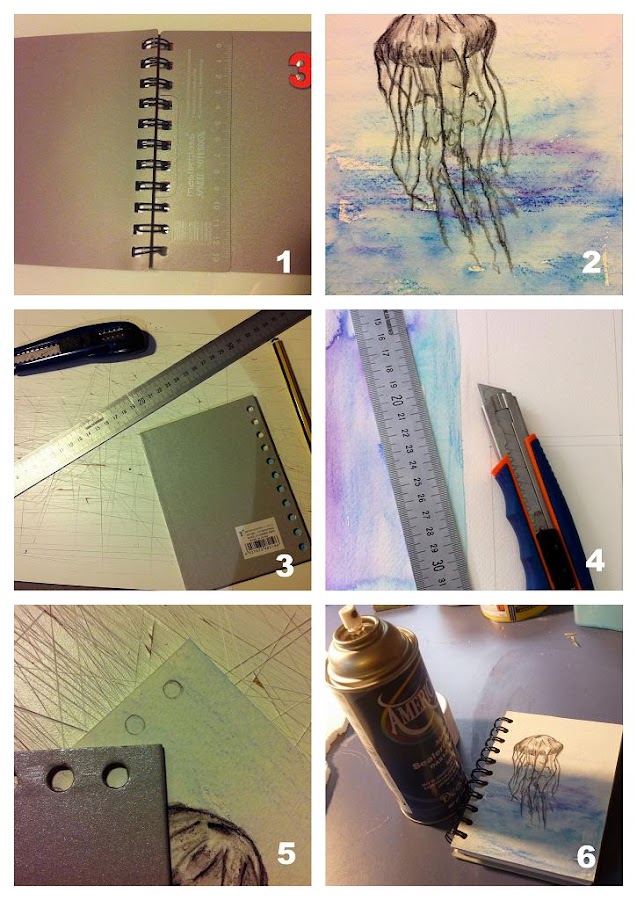 6- Echamos un barniz especial en spray para proteger la acuarela (lo podéis sustituir por laca del pelo, en caso de apuro) y montamos de nuevo la agenda