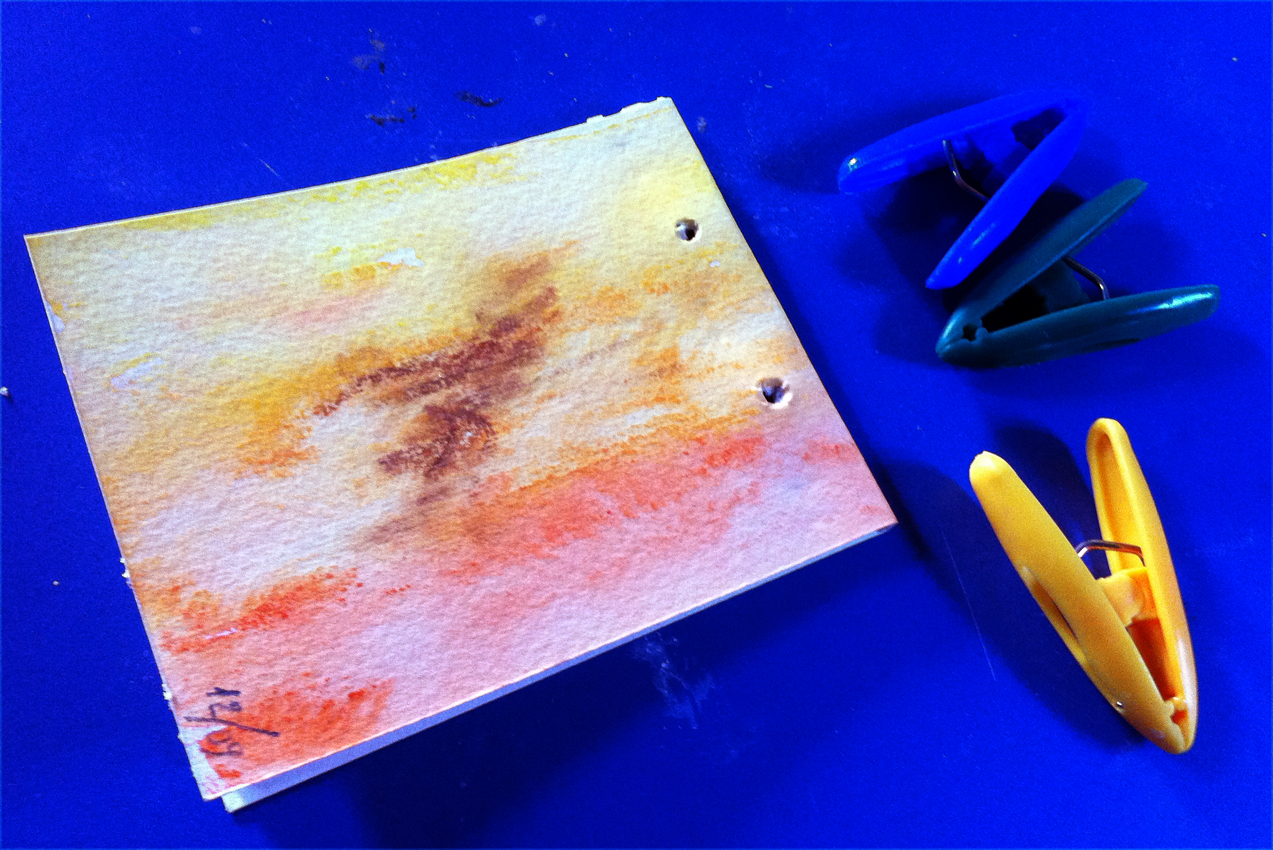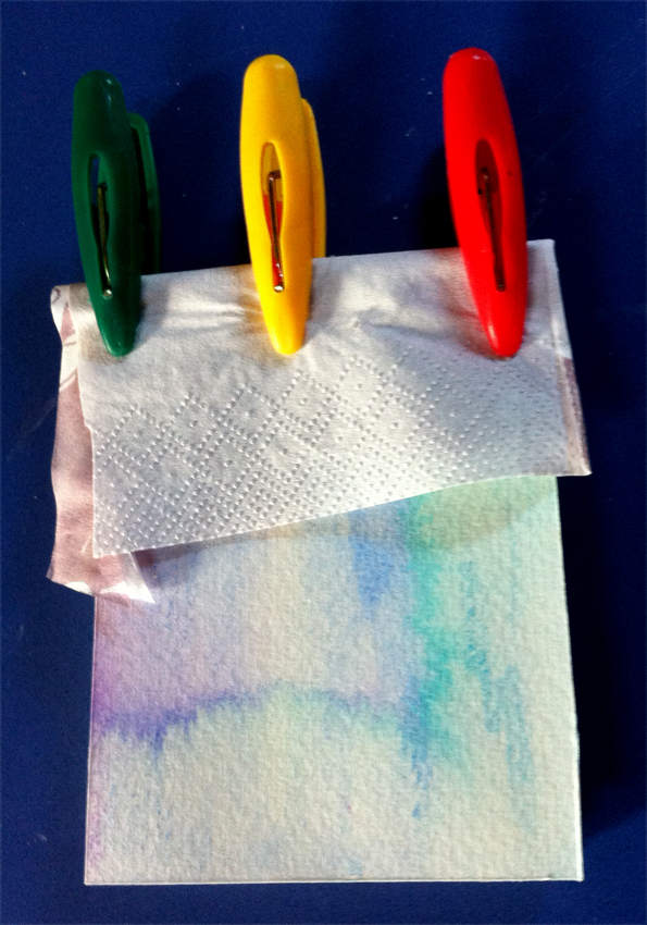 Con ayuda de pegamento ó cola (ligeramente diluida) pegamos la cubierta al cuadernillo de notas y dejamos secar totalmente. Para que quede bien sujeta, ejercemos presión con unas pinzas (el papel que veis en la foto lo hemos usado para evitar marcas de las mismas).