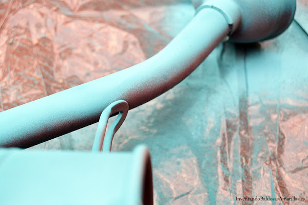 Empezamos a decorar nuestras piezas con una capa de pintura de tiza en spray. En a mesa de madera usé primero el color negro y en la regadera el turquesa. Con el spray tenemos que agitar el bote y dar pasadas rápidas para evitar que se acumule. Es mejor dar varias pasadas rápidas que insistir durante más tiempo en el mismo punto. El acabado homogéneo lo vamos a lograr evitando inicidir en un punto durante varios segundos.