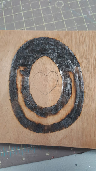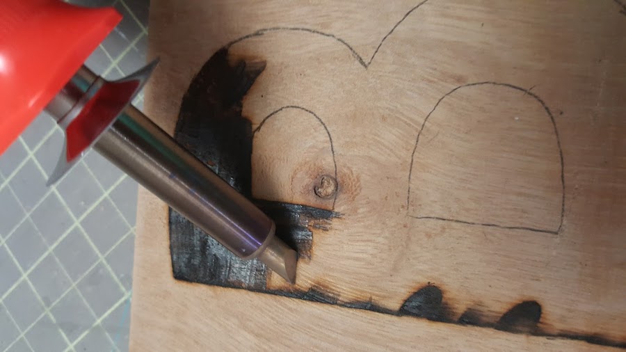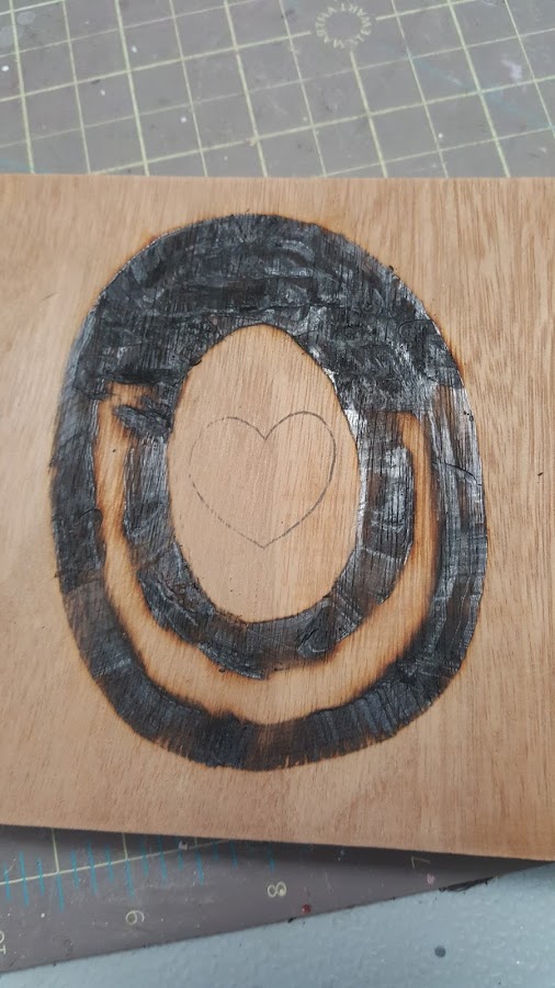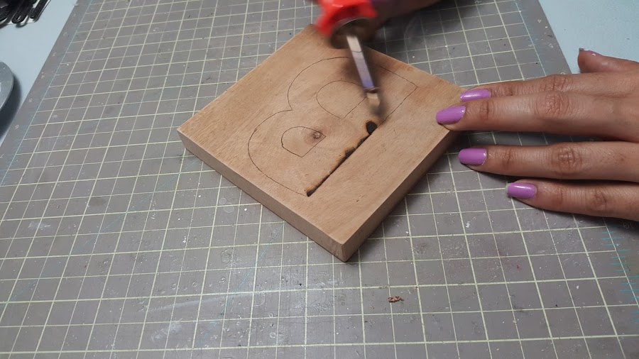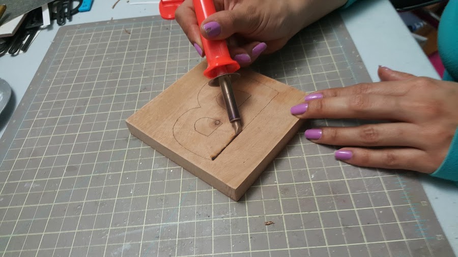 Encendí el pirógrafo, el que yo tengo es muy básico, no se le puede controlar la temperatura, solo se puede jugar con tiempos de contacto y presión, para estas letras mantuve el quemado lo más posible para obtener este color oscuro
