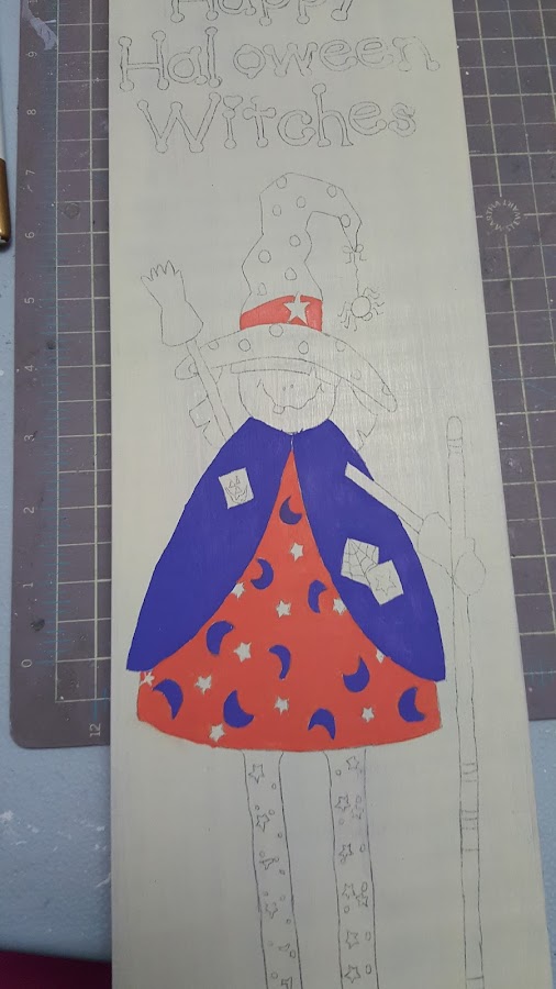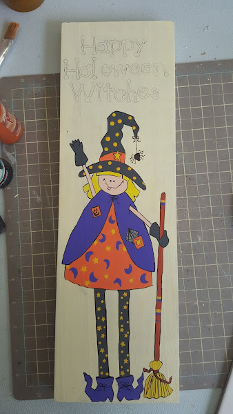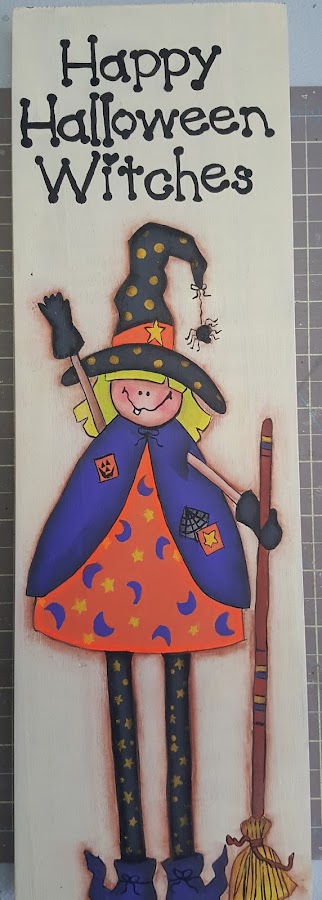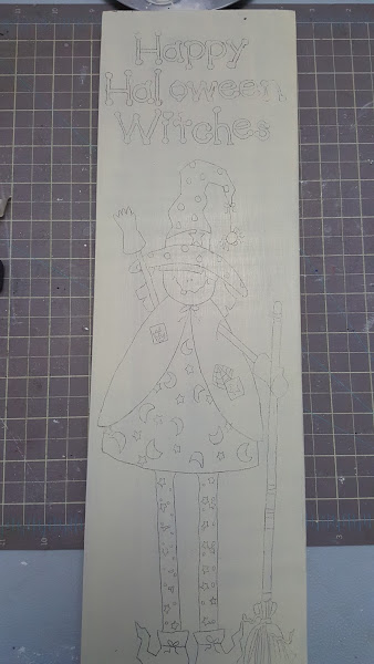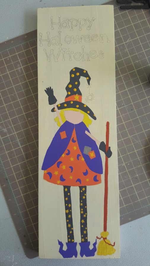Para el cuadro de la brujita, sellé la madera, la pinte con blanco antiguo, y transferí la imagen con papel transfer