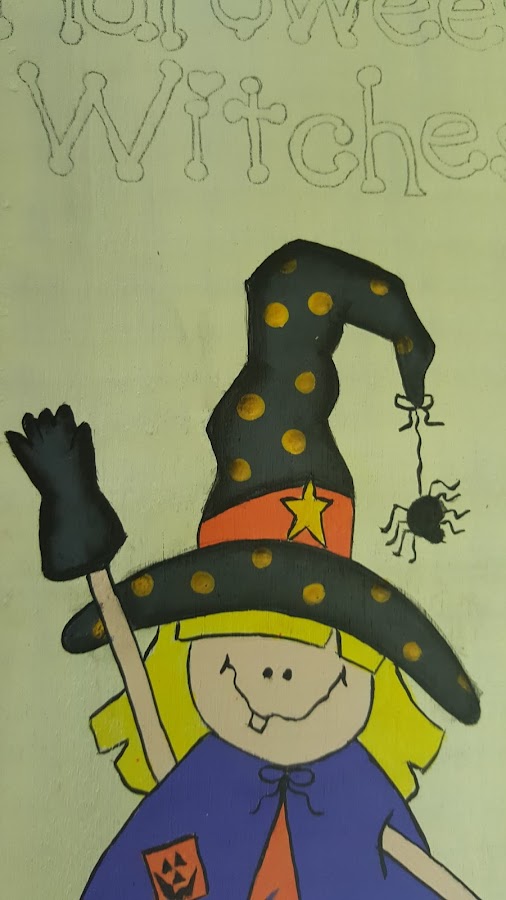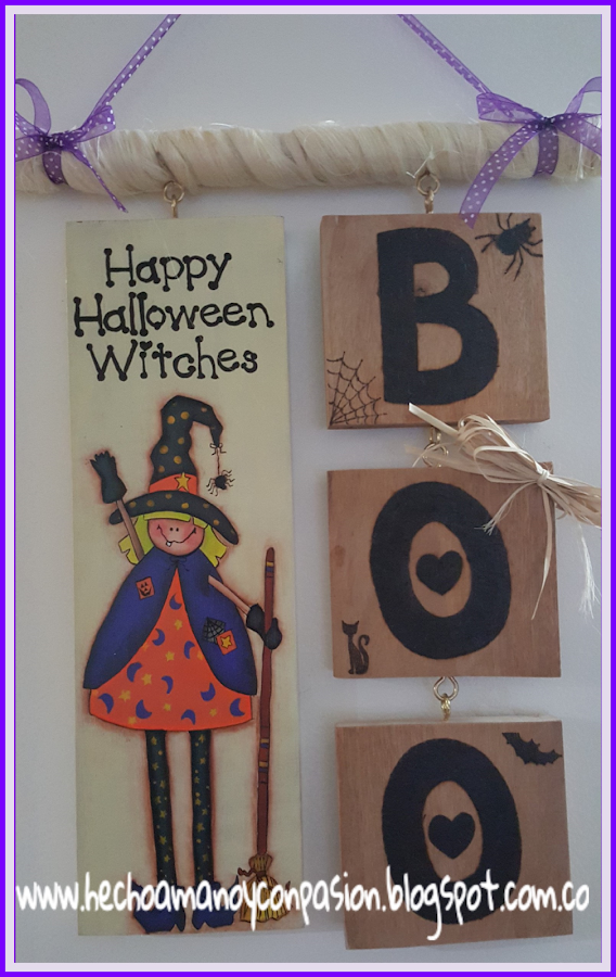 Forré un palo de balso con paja donde fije las tablas y para poderlo colgar le amarré una cinta de color morado que combinara con el color del vestido de la brujita y le pegue un moño de rafia a la primera letras "o"