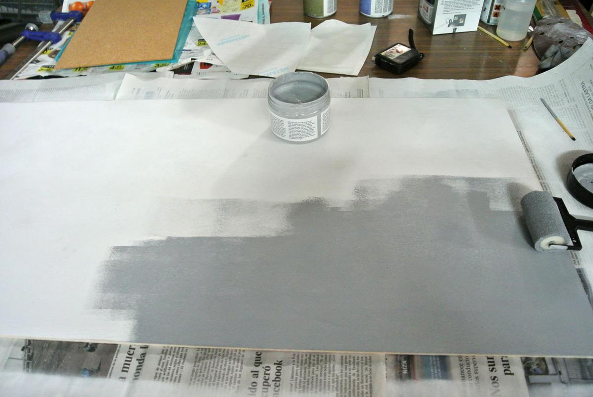 Continuamos dando una capa de imprimación a la madera, para que se adhiera bien la pintura magnética.