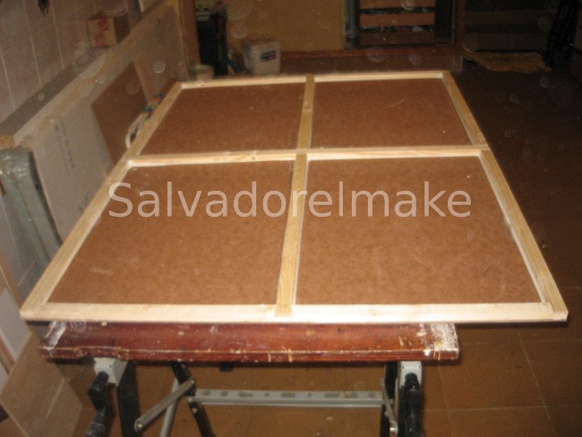 Para que sea más estable lo sobregruesamos con un marco de madera que además de hacerla más fuerte nos da un elemento para sujetar los enganches para colgarla después.
