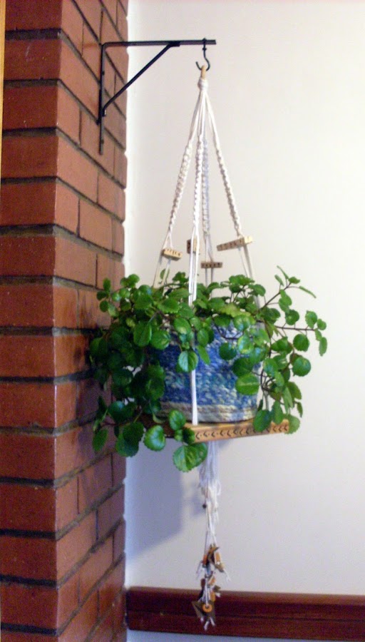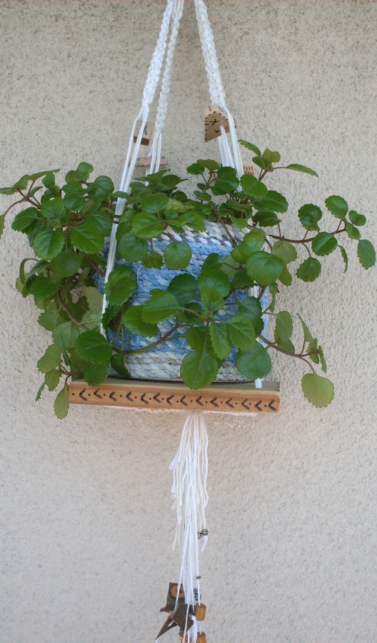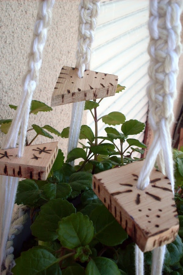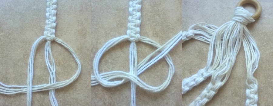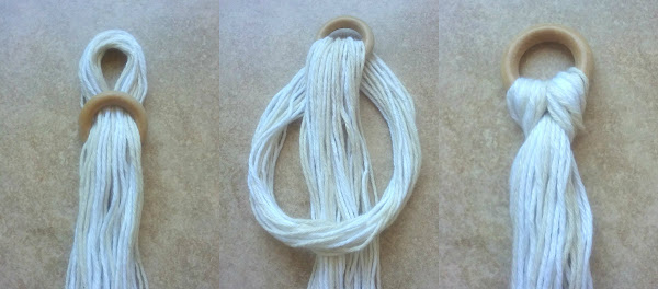 Al momento de realizar el "tejido del hilo" deberán cortar los hilos multiplicando por 3 el largo que deseen del portamacetas total, luego ponerlo doble y pasarlo por la argolla de madera como se observa en las fotos aquí debajo...