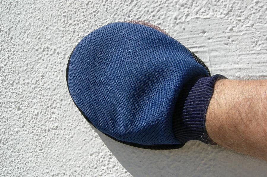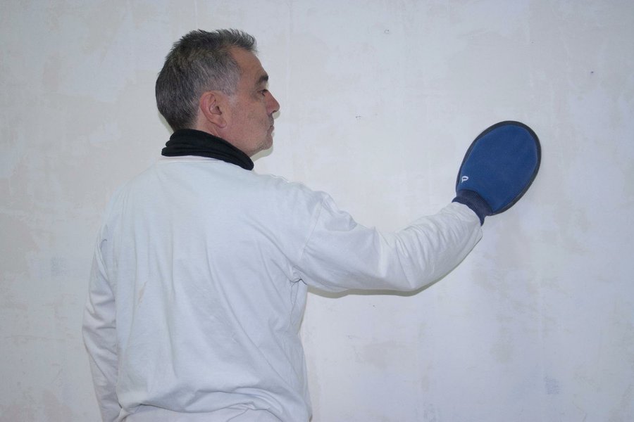 4. Después lijaremos toda la pared para conseguir el mejor acabado, usando el guante de velcro para las partes de más difícil acceso.