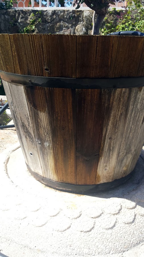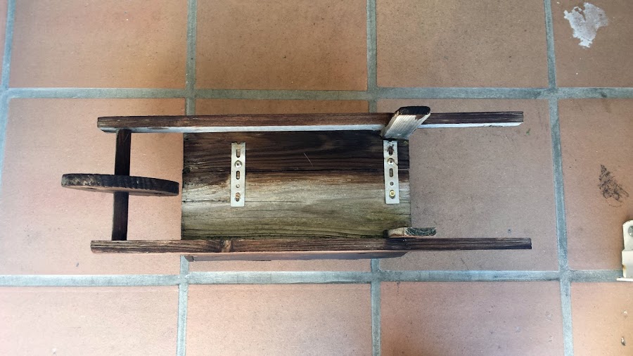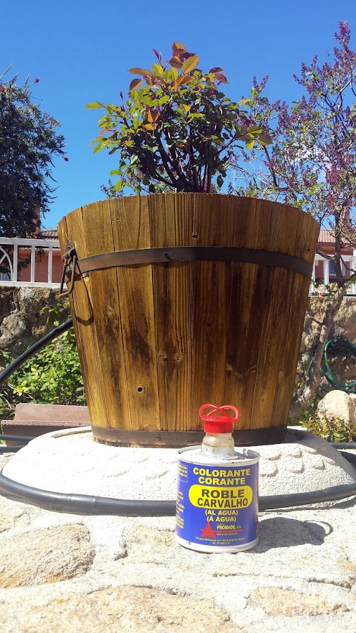 Elegí un lasur color nogal, pero también utilicé un bote de tinte, de un color indefinido porque es el resultado de ir mezclando los restos de otros colores distintos (cerezo, roble).