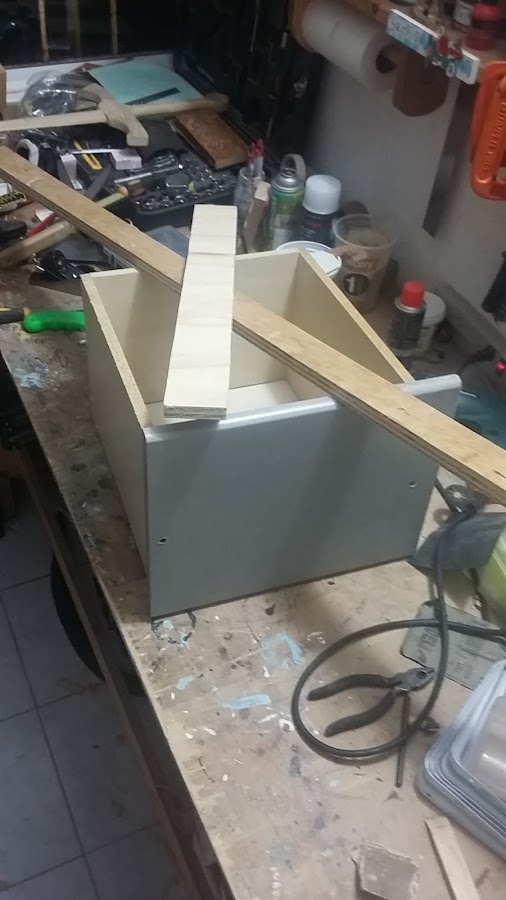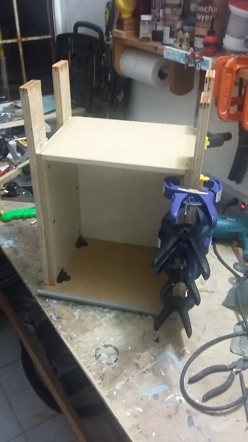 2. Ya teniendo los cajones sólidamente armados y reforzados, saqué las tablas de triplay que tenía por ahí y tomé las medidas. Decidí que mis burós quedarían a la altura del colchón mismo que resultó en casi 60 cm, así que medí y corté. Luego comencé a armar usando pegamento y tornillos nuevamente para asegurarme que quedaran bien fijos