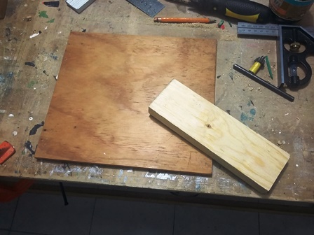 1. Comenzando por elegir el material , estas tablas estaban en mi pila de desechos esperando cobrar vida y las escogí por su tamaño, principalmente, una tabla de triplay o laminado y otro pedazo de pino. Las medí una con la otra y coloqué una cápsula usada para ver la dimensión del tamaño quedando casi perfecto.