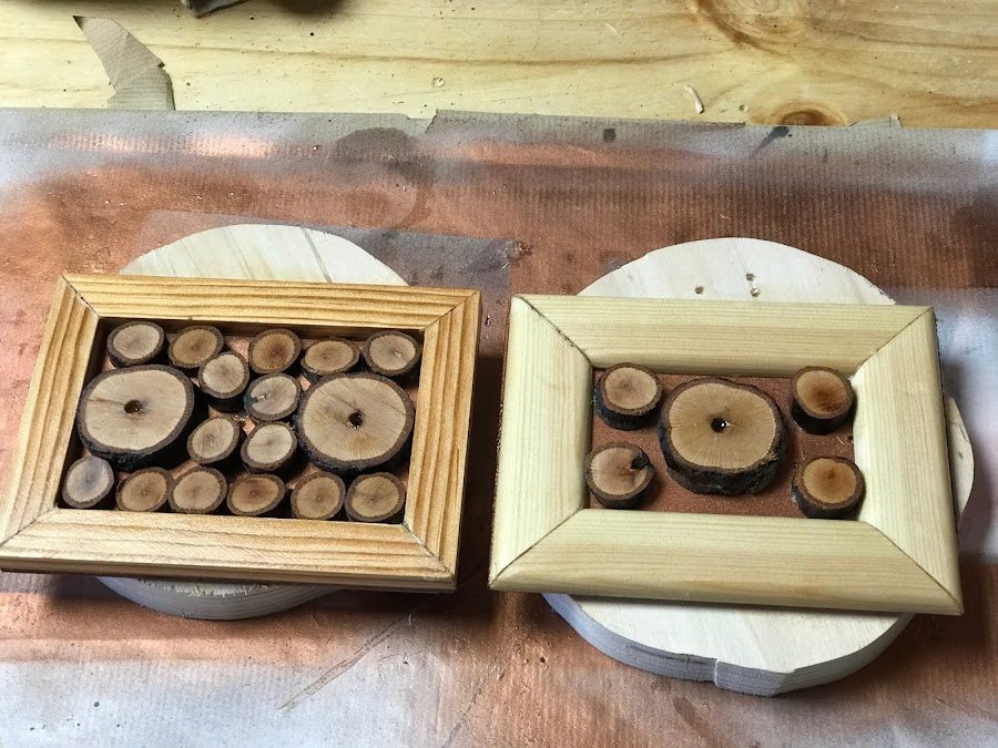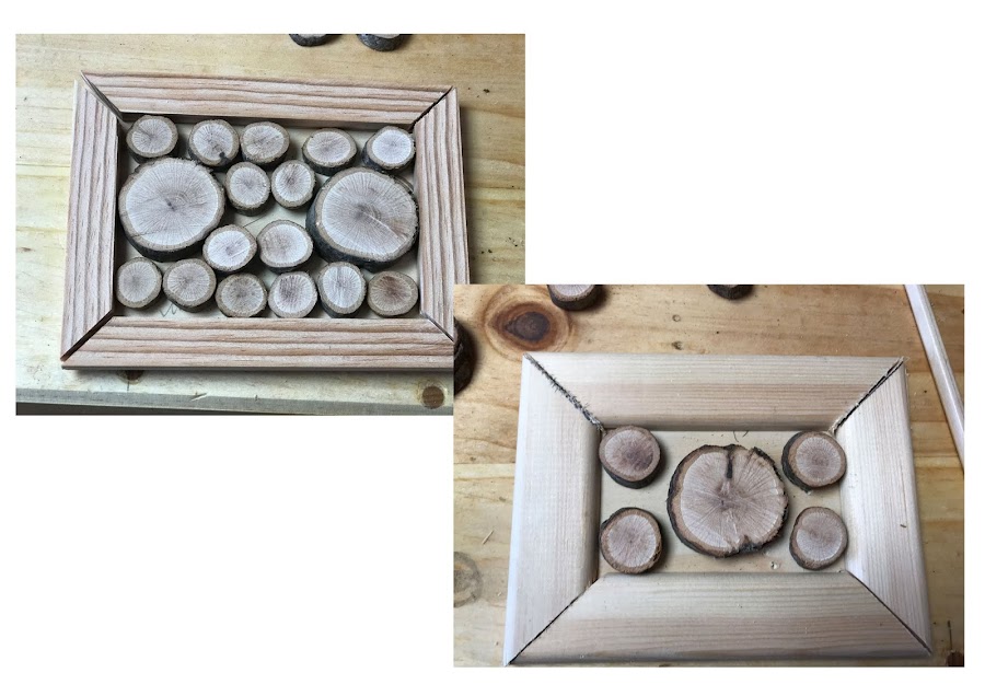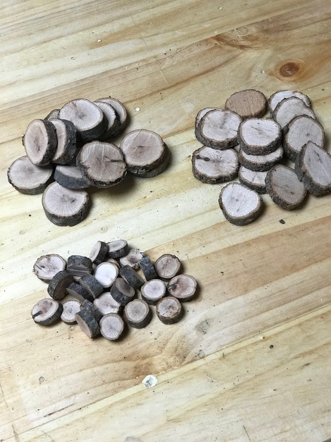Elegí dos tronquitos, uno mas grueso que otro, y fuí haciendo varios cortes. Para que todas las rodajas sean iguales, coloco un tope en la ingleteadora ayudándome de una pinza para que el corte sea idéntico uno de otro.