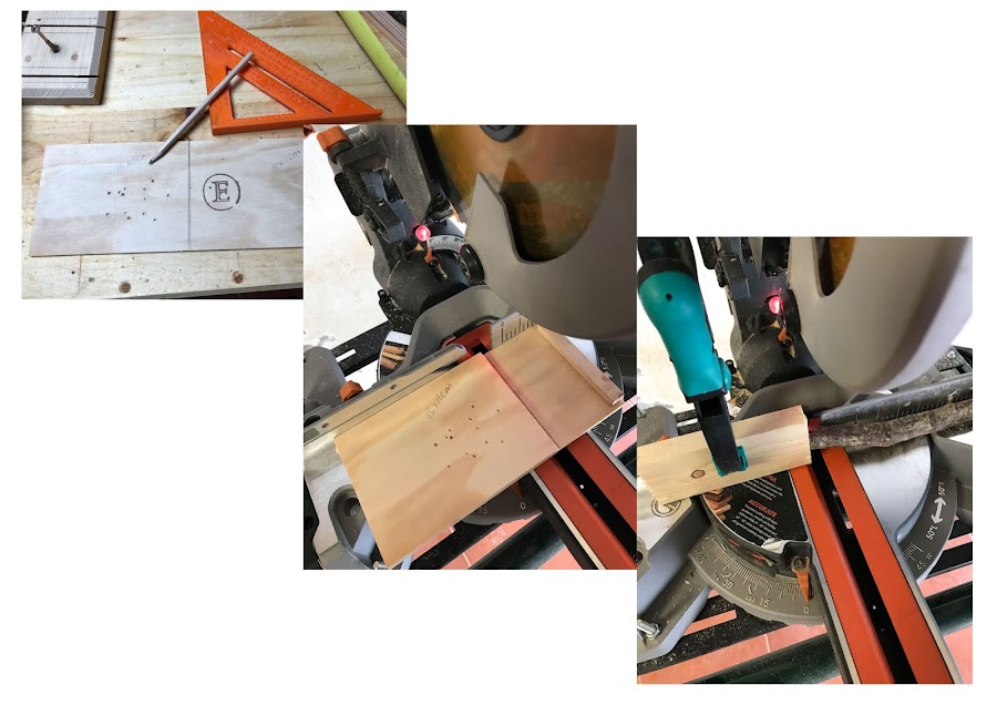Marqué en la tapa de la caja de vino las dos bases que neceitaba. En mi caso, elegí 15x11 cm. Hago un primer corte con la ingleteadora y ese mismo corte lo coloco encima del otro para que los dos cortes sean exactos.