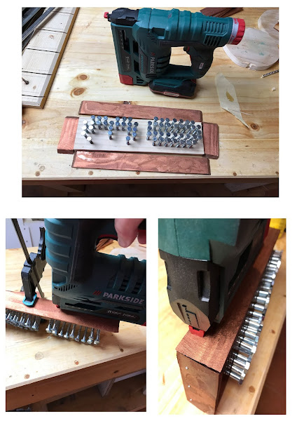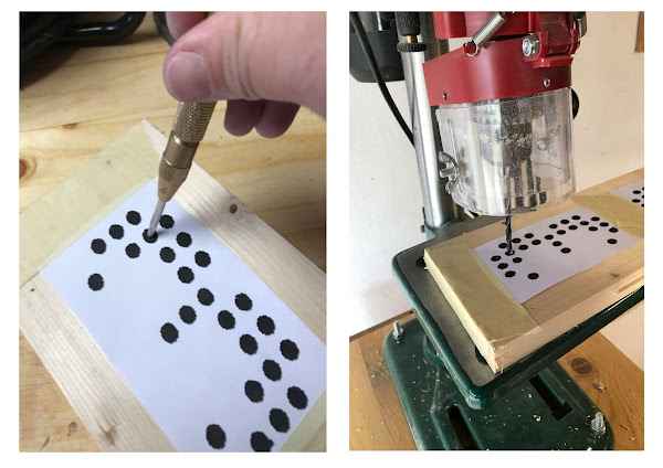 Una vez recortados, lo coloco en la madera de pino sujetos con cinta de carrocero y con un punzón voy marcando donde hacer cada perforacion. Para este proceso y que para que sea lo mas recto posible a 90º utilicé el taladro de columna .