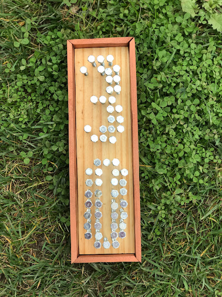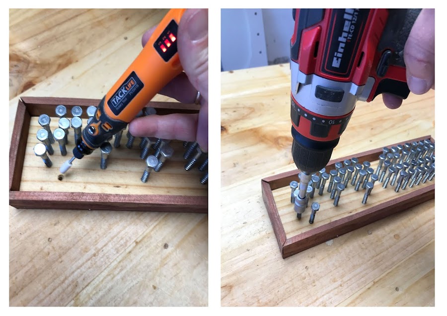 IMPORTANTE: no llegar a perforar toda la madera, apenas unos mm para luego colocar los tornillos lo suficientemente fuertes para que no se caigan pero que sobresalgan para que se puede leer bien el número desde lejos.