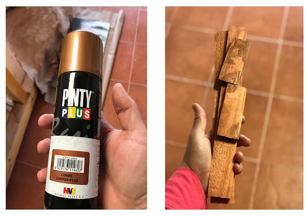 Mientras tanto fuí cortando con la ingleteadora los listones a 45º para formar el marco de alrededor (en uno de los lados, el corte a inglete no salió del todo limpio, y no tenía mas listones, asi que se quedó asi ) Después los pinté con spray efecto cobre para que hiciera contraste con el color del pino. Espectacular :)