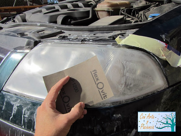 A continuación, lijamos los faros. Esto se hace de forma gradual, utilizando las lijas de menor a mayor numeración. Lijamos trazando círculos por toda la superficie del faro, y siempre mojando generosamente el papel de lija, para que nos se emboce la lija con el plástico del faro y para no arañarlo. Utilizamos primero la lija de 250 O 280, para renovar la superficie del faro eliminando la capa deteriorada y los desperfectos más graves.